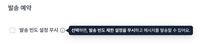 • 캠페인 유형: 캠페인에 특정 태그(ex. ‘프로모션’, ‘쿠폰만료’ 등)를 설정하여 같은 유형의 메시지가 과도하게 발송되지 않도록 발송 빈도 설정