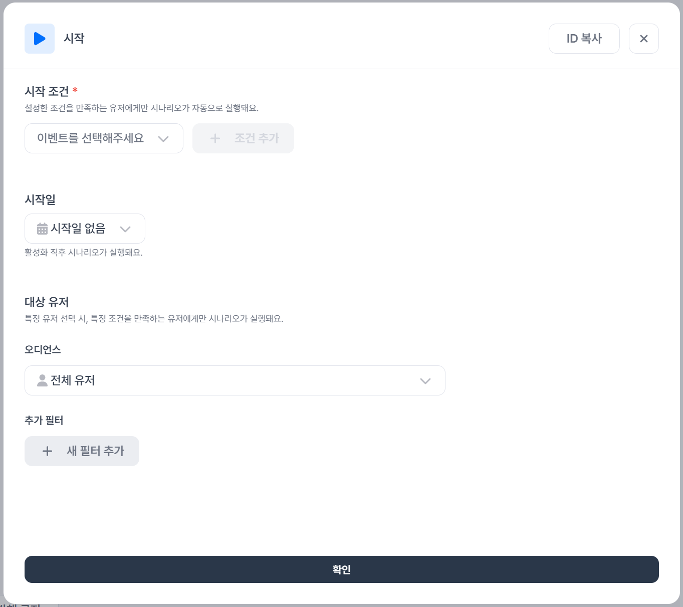 - 대상 유저: 시나리오에 진입할 대상 유저 범위를 조건으로 설정