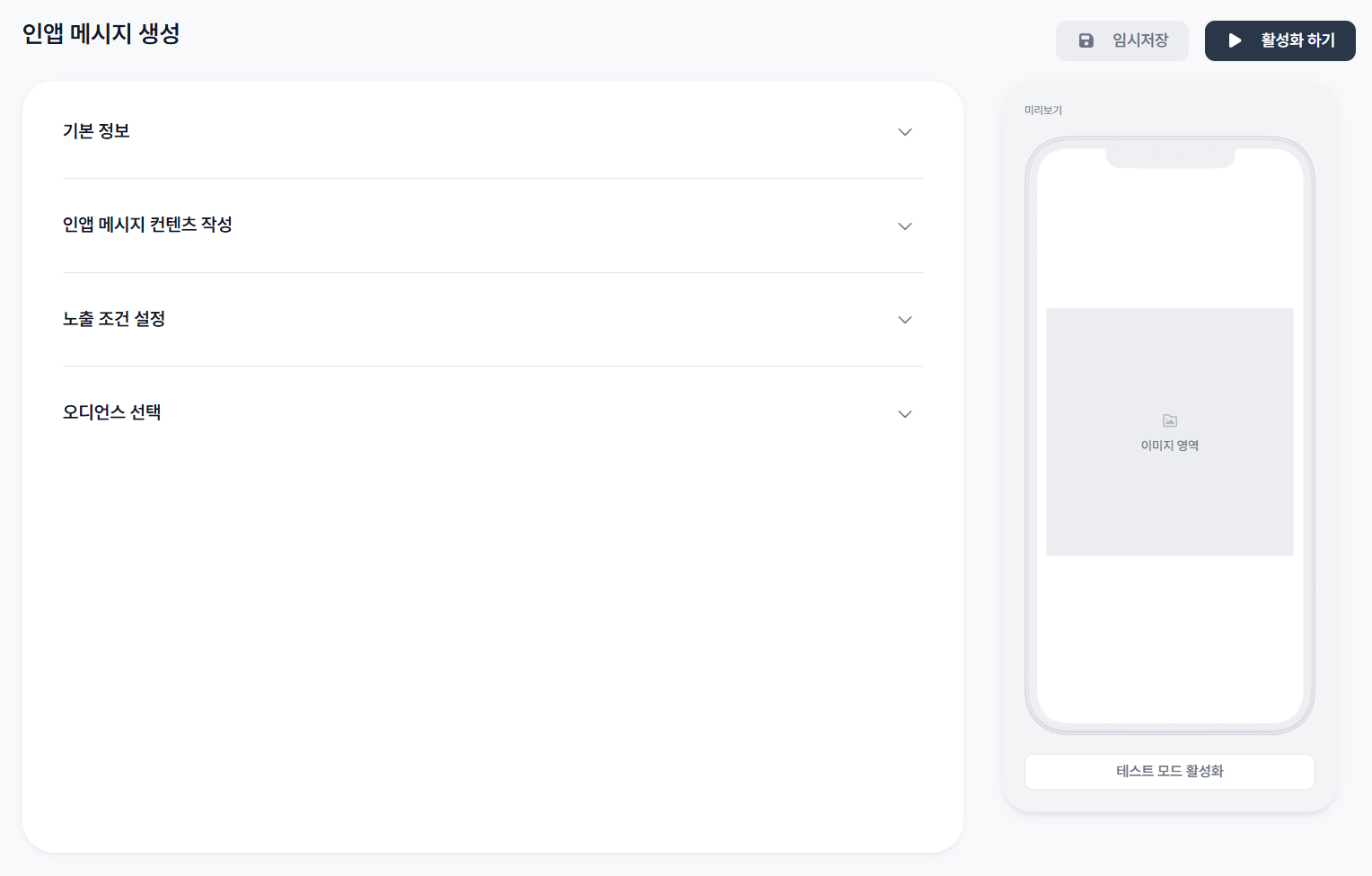 - 테스트모드 : 테스트모드 상태의 인앱메시지를 나타냅니다.