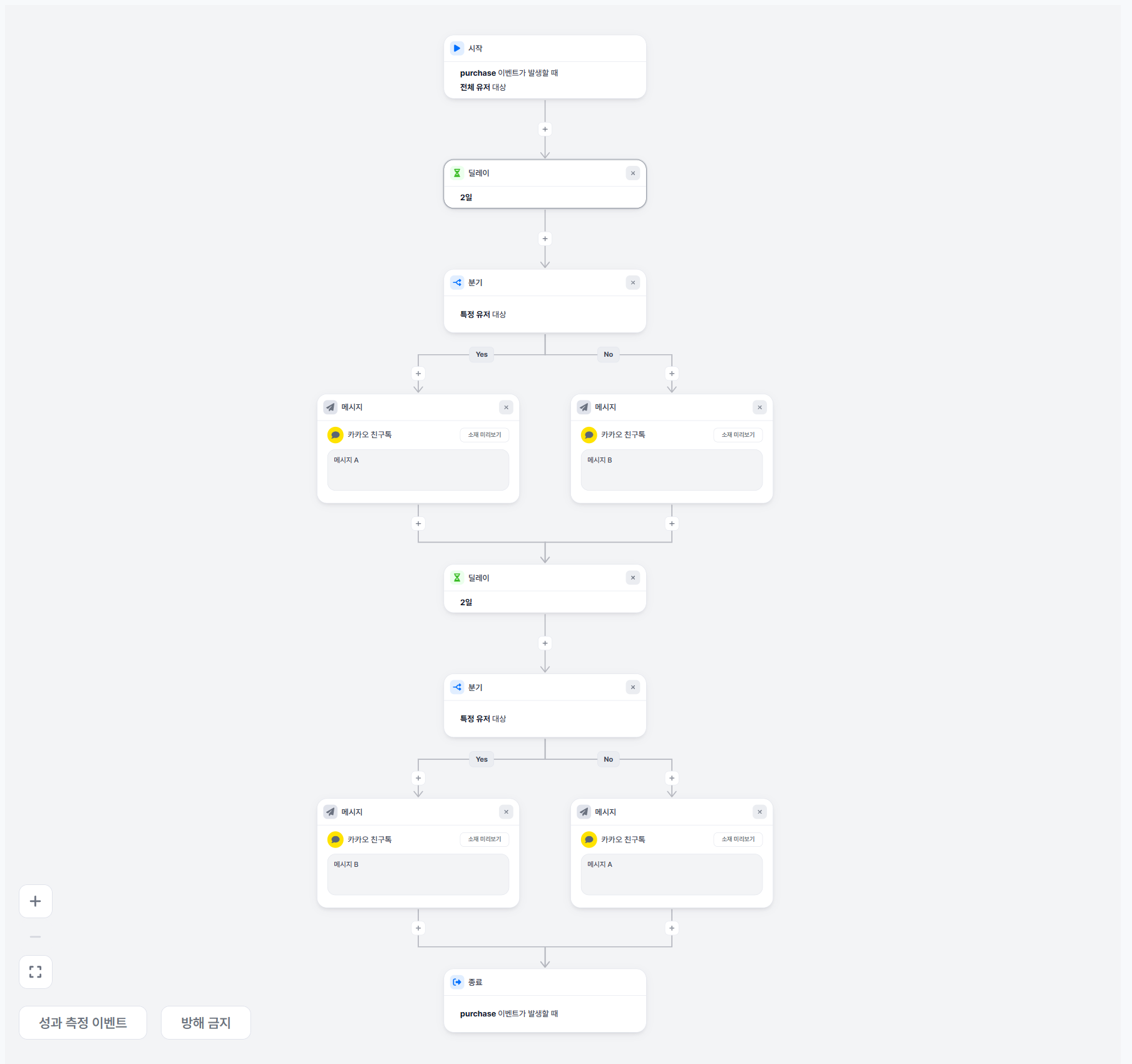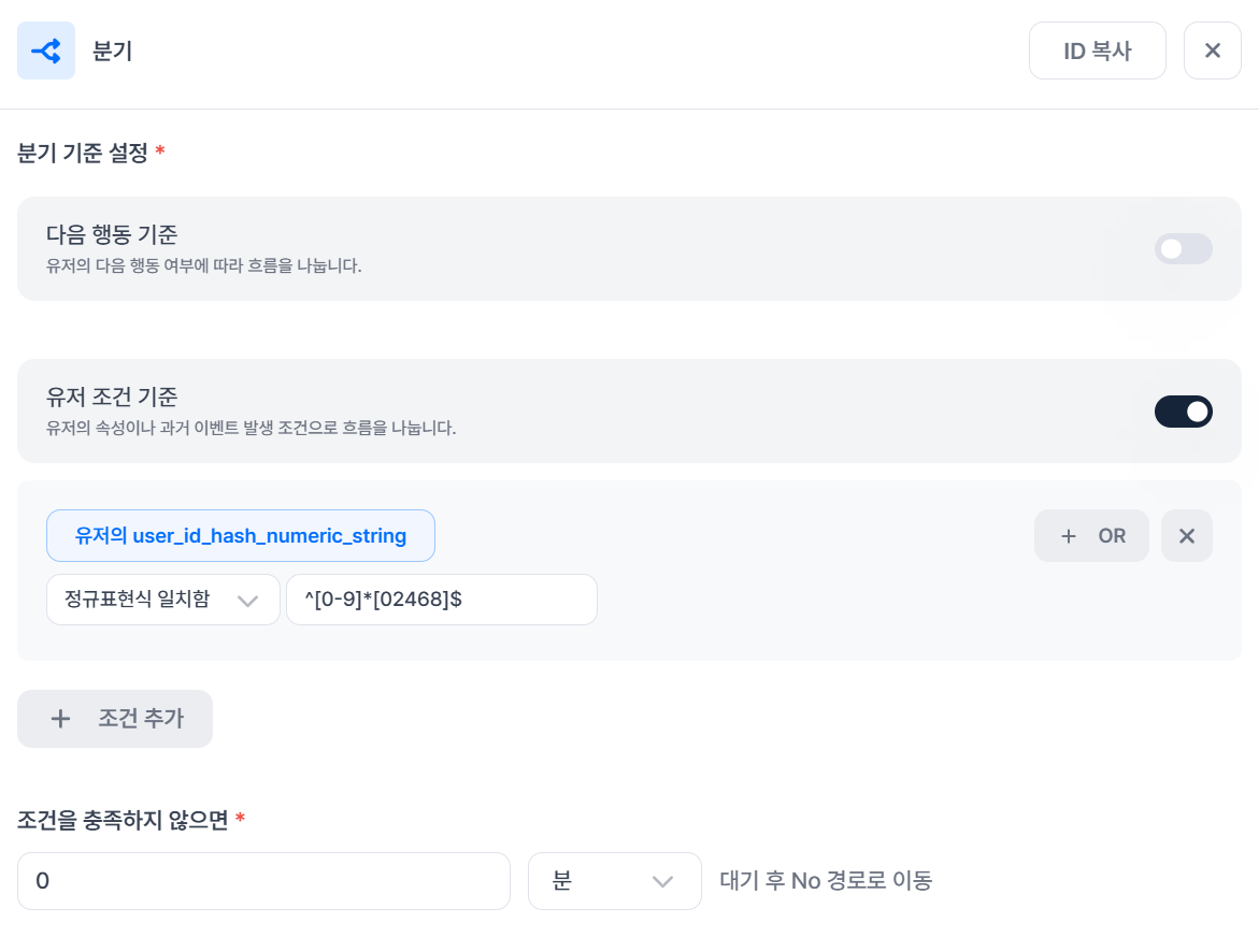 분기 노드를 통해 유저를 두 그룹으로 나눌 수 있습니다.다음과 같이 설정하면, user_id 끝자리가 짝수와 홀수인 두 그룹의 유저로 나뉘어 각각 Yes와 No 분기로 이동하게 됩니다.
